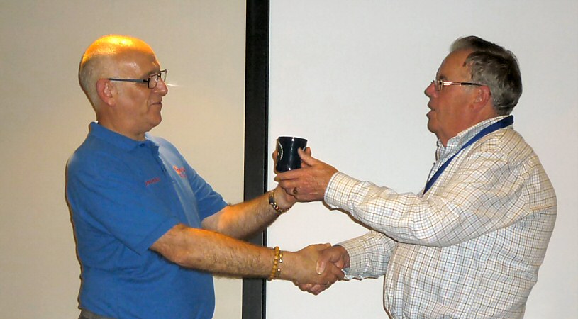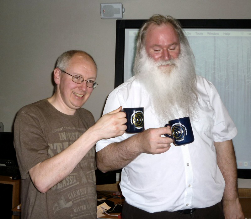John G8DET running the raffle - and Carl G3PEM presenting the CARS MugOur thanks for a most enlightening and well presented talk. You can see John at Microwave Roundtables, the RSGB Convention in October or the monthly Codgers 'Last Saturday Breakfast' near Orwell.