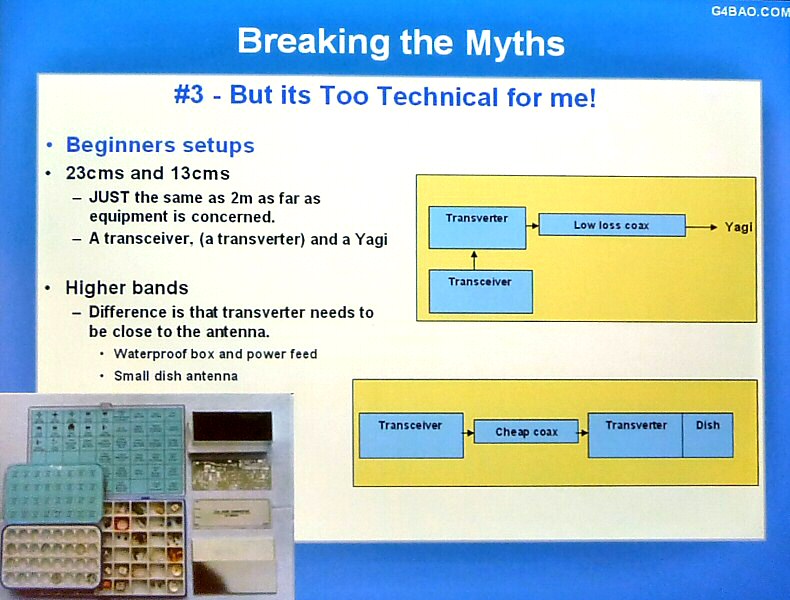 John G4BAO with a high gain 23cm Yagi Antenna introducing his talkWhy Bodger? - well it highlights that microwaves is a field where DIY/Construction is alive and well - although nowadays many items are available off the shelf as well. The amateur licence gives us access to a huge amount of bandwidth relative to HF, so you certainly aren't as limited to just narrow modes, but the move from the original very wideband sources to narrowband did offer huge benefits. In terms of history, John gave a quick summary of how technology had evolved (and continues to do so) over time:-