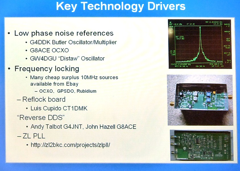 A distinguishing feature of microwave bands is the availability of high antenna gains and the absence of atmospheric noise making it worthwhile aiming for state-of-the art Tx stability and Receiver performance. This has driven new GPS-locked sources and innovative modes such as JTxx (initially for moonbounce) that have all rippled down into the lower amateur bands.