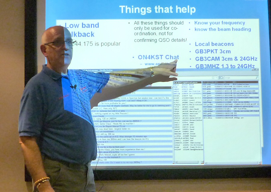 Modern Microwave DX is very directional and long range, resulting in 2m talk back falling out of favour and the Internet helps instead. Most terrestial microwave DX/spots are notified by chat rooms, of which ON4KST by far the most popular. Modern technlogy and free software also helps those who want to start on a low budget - John had a low cost Dongle and SDR-Touch on a low-cost Android tablet that could receive 23cms inc the GB3MHZ Martlesham Beacon. UK Microwave Group (UKuG) membership , which is just £6/year, entitles you to the monthly 'Scatterpoint' magazine, free surface mount components (the UKuG 'chipbank') and a lot of technical advice and elmers.