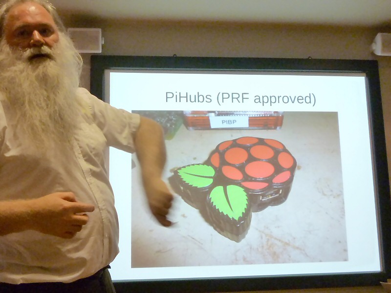 After the break and raffle, David Whale explained his role as STEM ambassador and how computing and coding in schools had become stagnant since the decline of the BBC Micro and the introduction of the Personal Computer. With the Pi (and cheap electronic accessories) comes the ability to easily transport up to 50 "computers" for a lunchtime "Pi Club".