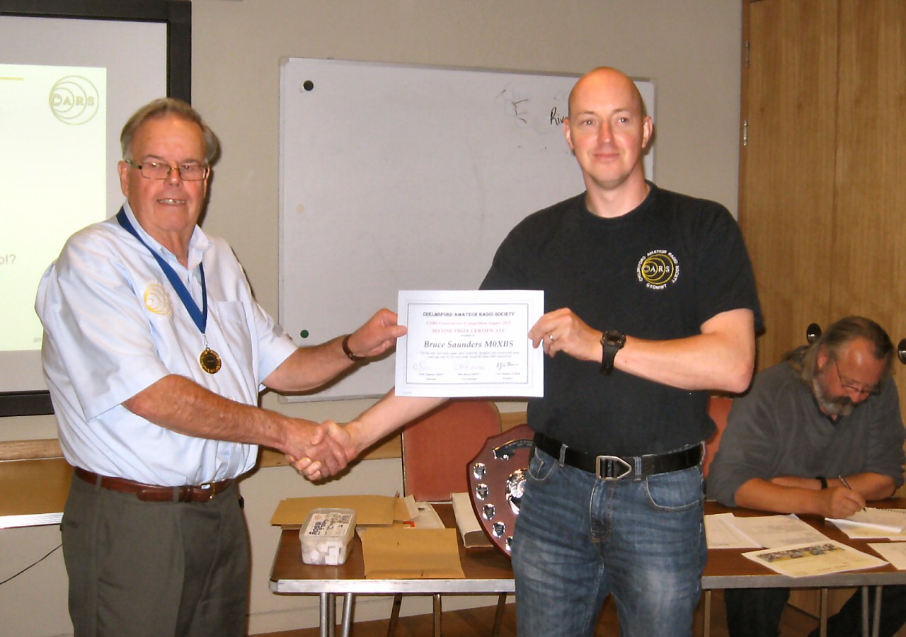 Carl then presented the "Amateur Of The Year" which this year went to Clive Ward G1EUC posthumously. The committee had thought about it and suggested this. Carl asked the assembled membership for a proposer - Richard G7OED obliged and the assembled membership agreed unanimously. Next were the presentations of the certificates for the Constructors Competition. There were four to award - in fourth place and named the "First-timers prize" was Steve G4HSK and his 10m-144MHz Transverter. In third place was Peter G3SUY for his Mobile Whip. In second place was Bruce M0XBS with a Valve Audio Amplifier and in first place was Charlie M0PZT with a Log Book program called PZTLog.
