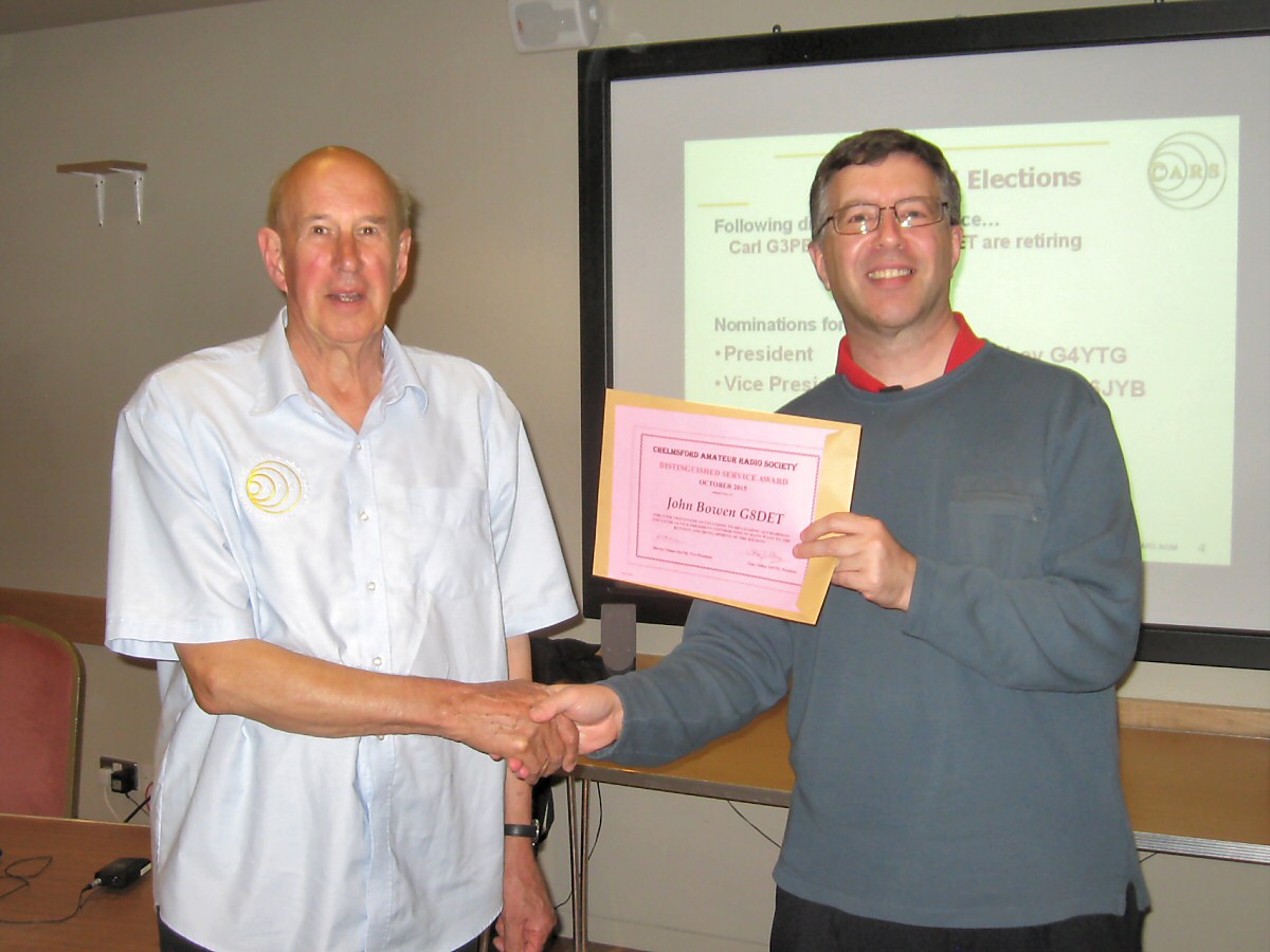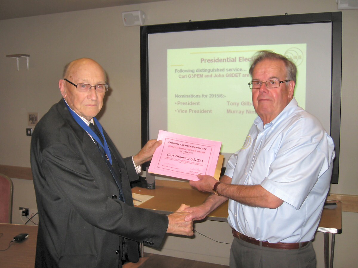 Carl continued with the election of a new Vice-President of Murray G6JYB, as John G8DET was standing down. This was proposed by John G8DET and was agreed by a show of hands by the attending membership. Certificates for "Distinguished Service" were then presented to Carl and John for their outstanding work.