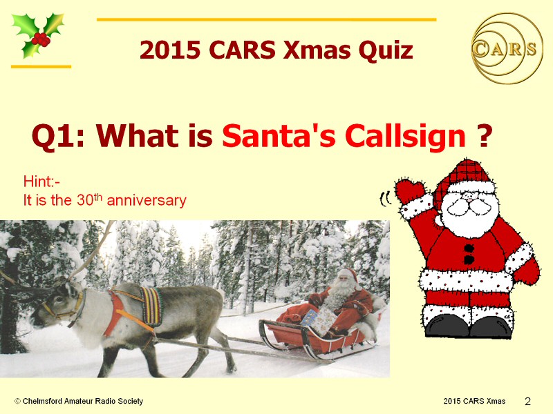 By CARS Members & VisitorsLike last year, the December meeting had a seasonal flavour and was more of a social occasion. Features included mince pies, a couple of special quizzes by John G8DET & Murray G6JYB and the 'tune-a-dipole' game by Chris G0IPU (used on Foundation courses).