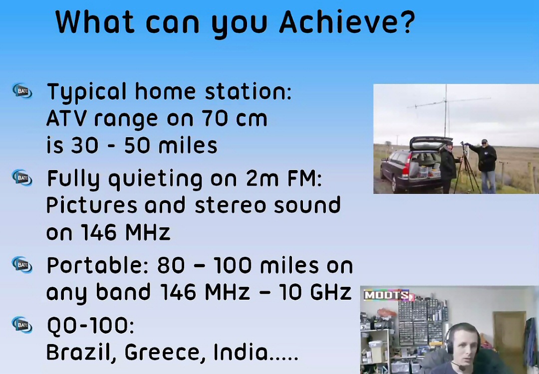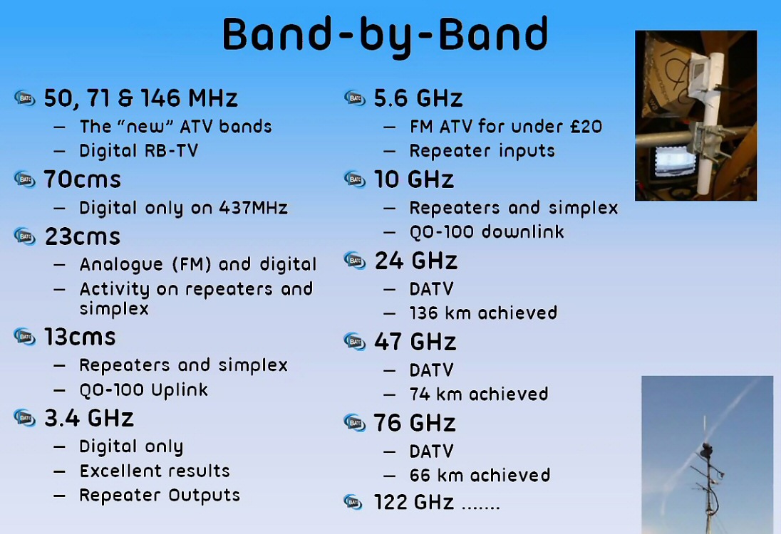 Ranges you can achieve with ATVThe latest developments have seen the 50 MHz bands brought into use around 51.7MHz as it only needs ~300kHz of bandwidth which is achieved by DVB-S2 (QPSK) and High Efficiency Video Coding (HEVC, H265 picture coding, but does need very linear amplifiers. This ongoing progress has recently seen the top of the 29MHz/10m band now also available in the latest band plans for DX experiments. QPSK based modes remain the most common but ongoing work to develop narrowband OFDM is underway which has better multipath performance for long distance DX.