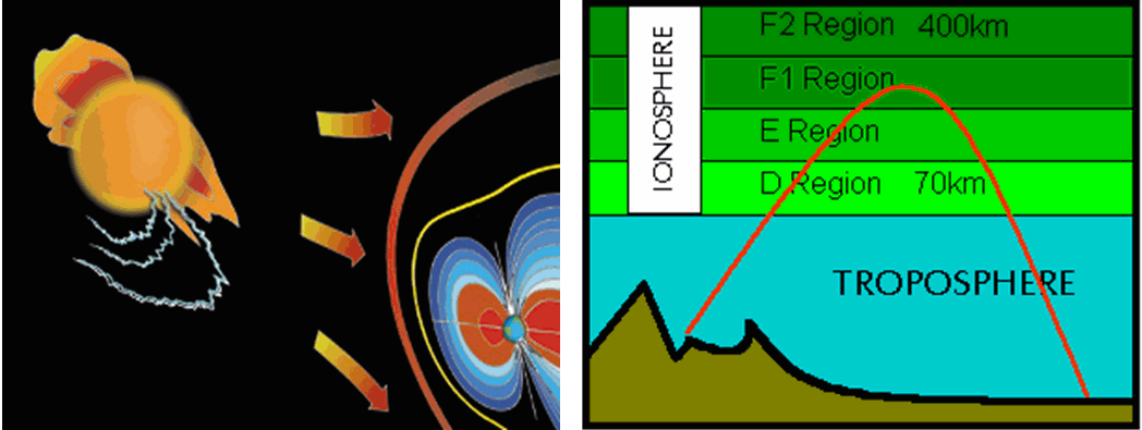 The Earths Ionosphere is key for HF propagation in the ~70-400km range. It is strongly influenced by Solar-UV every day and season; and then modified by ionised particles in the solar wind - which varies with both the the solar cycle and short term surges and disruptions from solar flares. The earth’s magnetic field largely shields us and feeds much of this to the poles (and thus auroras). On a much longer period, the earths field also varies (as our magnetic poles slowly drift) and can have local low points such as the South Atlantic Anomaly which can be a hazard for small satellites.