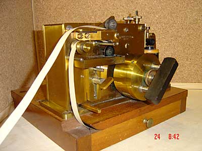 Two views of the Museum's Paper Tape Printer. These were made in Germany by Siemens & Halske in about 1850. The arm on the front winds the clockwork mechanism. The solenoid (right) activates the ink marker system & tape transport.