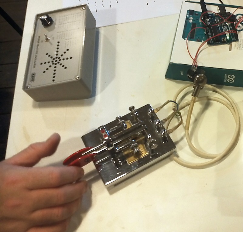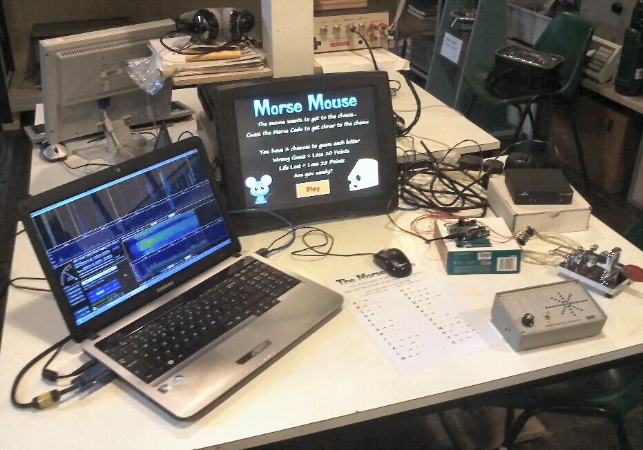 The Mouse game uses a Arduino-Uno controller and Morse key (Photos by Charlie M0PZT)Demonstrations included showing different signals on the frequency spectrum, decoding Morse Code visually plus a chance to play Charlie M0PZT's "Morse Mouse" game - this appeals to not only the youngsters, but also those who may have let their CW speed lapse.