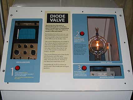 The public are invited to press a knob to see the AC full wave voltage from the mains and the rectified waveform with the old valve and compare it with the waveform using a Silicon Diode. The old valve has a 5 volt filament and is really bright - something few people would ever see.