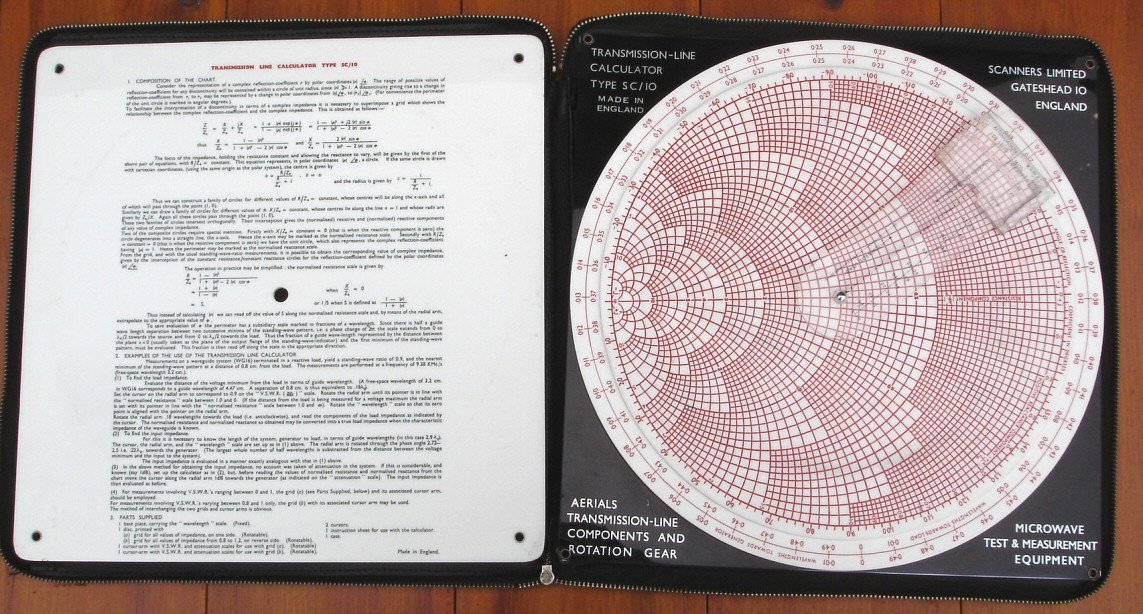 Smith charts enable plotting of impedance, Z and its inverse (i.e. admittance, Y) for design of matching circuits - a process that is usually performed by computers nowadays rather than by hand. The central circular chart can be rotated and the picture shows them in the rarer Admittance position - as used in the Marconi and CARS roundel logos. Normally they are used 180 deg around in the Impedance position. The chart was developed by and named after Philip H Smith in 1938. His original book is a collectors item.