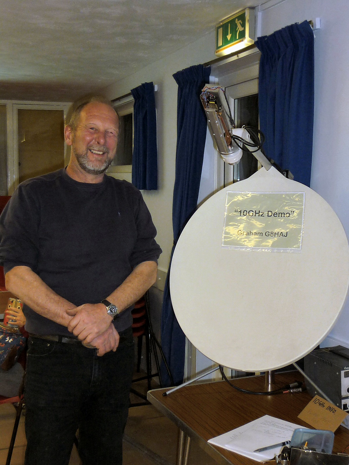 10GHz demo: Graham G8HAJ who joined us in November for a popular Hellschreiber demo, returned with a 10GHz SSB setup. The Foundation licence deliberately has this band and a generous 1W power limit (as there is plenty of antenna gain) to get experience at shorter wavelengths. You can start with a simple low-cost 3cm receiver using a standard satellite LNB and an SDR dongle. The kit in the photo has a higher performance popular DB6NT transverter and interface board. Other items include home made 23cm circuits