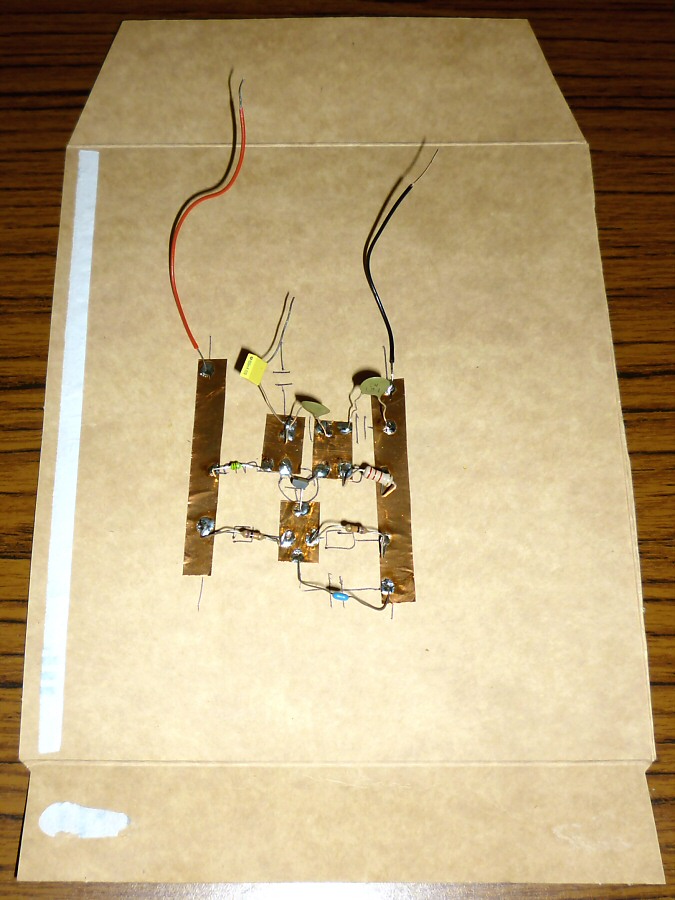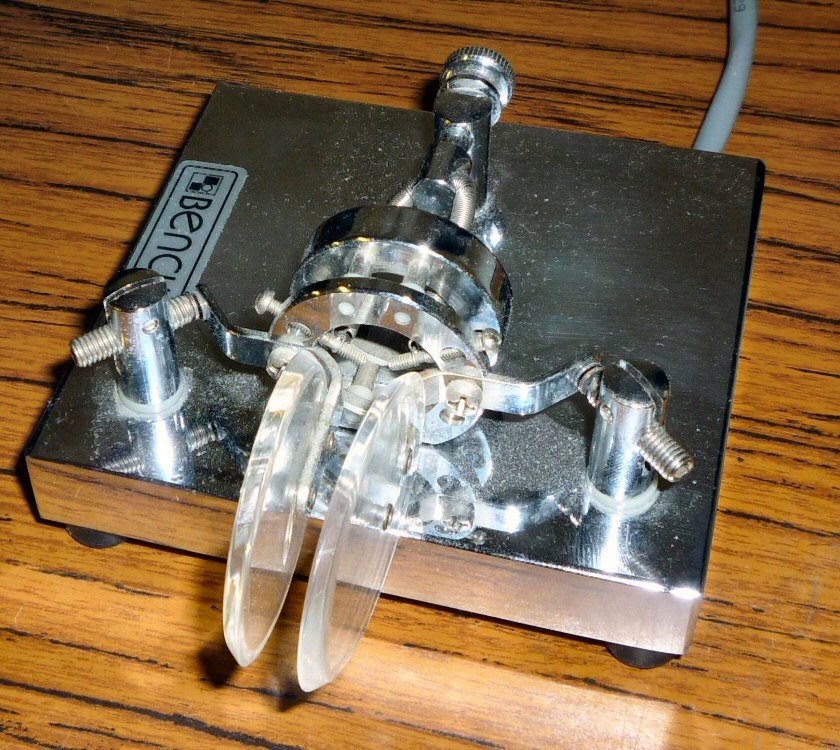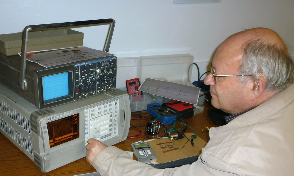 A polished chrome Bencher ST-2 style single paddle keyer- Testing, Testing: Mike G4NVT brought an oscilloscope and spectrum analyser for testing circuits, measuring frequency and filters. If you have anything you'd like tested, please bring it along in future. This month, Mike built a Colpitts Oscillator and tested it on the night, using an Easter Egg box as a circuit substrate!