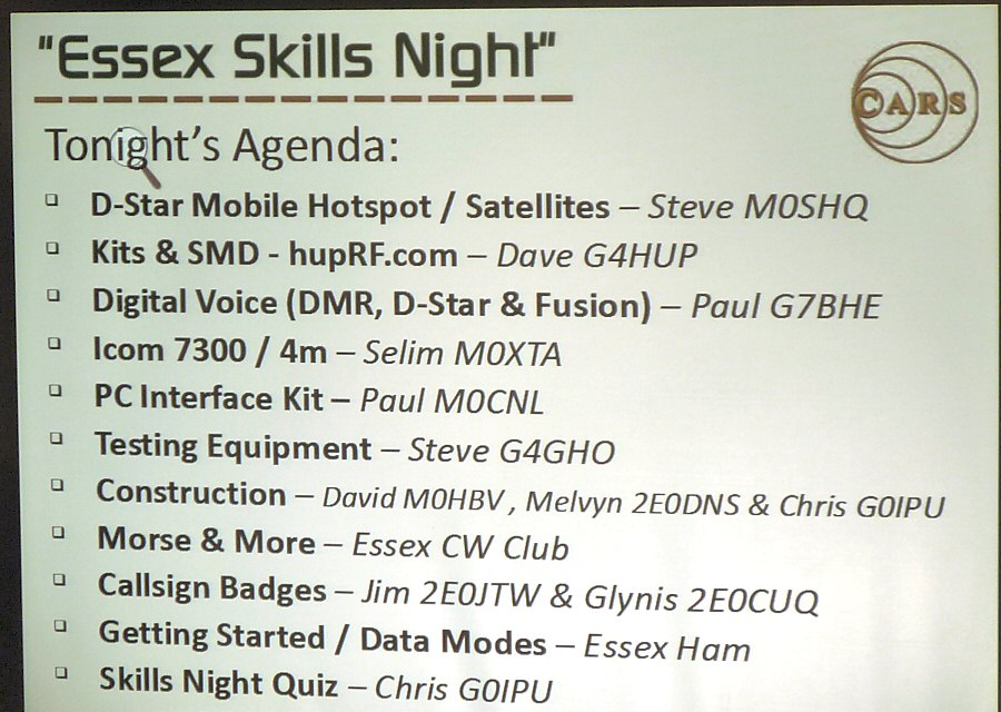 A good crowd of around sixty attended the Monday October 17th Essex Skills Night, hosted by CARS at Danbury Village Hall. Skills Coordinator Pete M0PSX was pleasantly surprised by the number of offers of demos and ended up with a packed agenda.