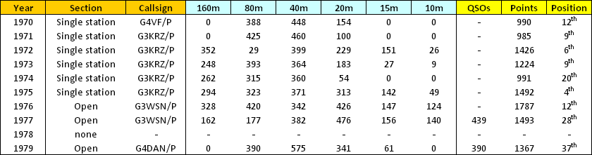 1974: The score was down on all bands, especially 20m and no QSOs were made on 15 or 10m. CARS finished in 20th place.
