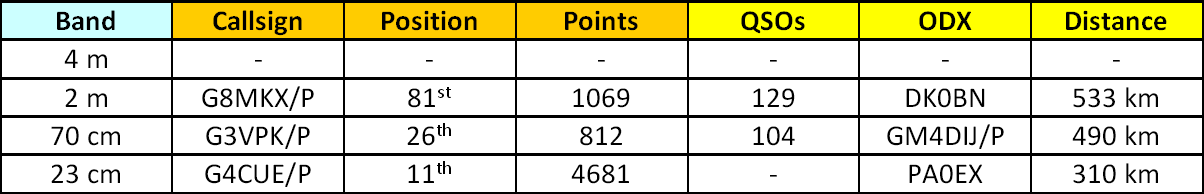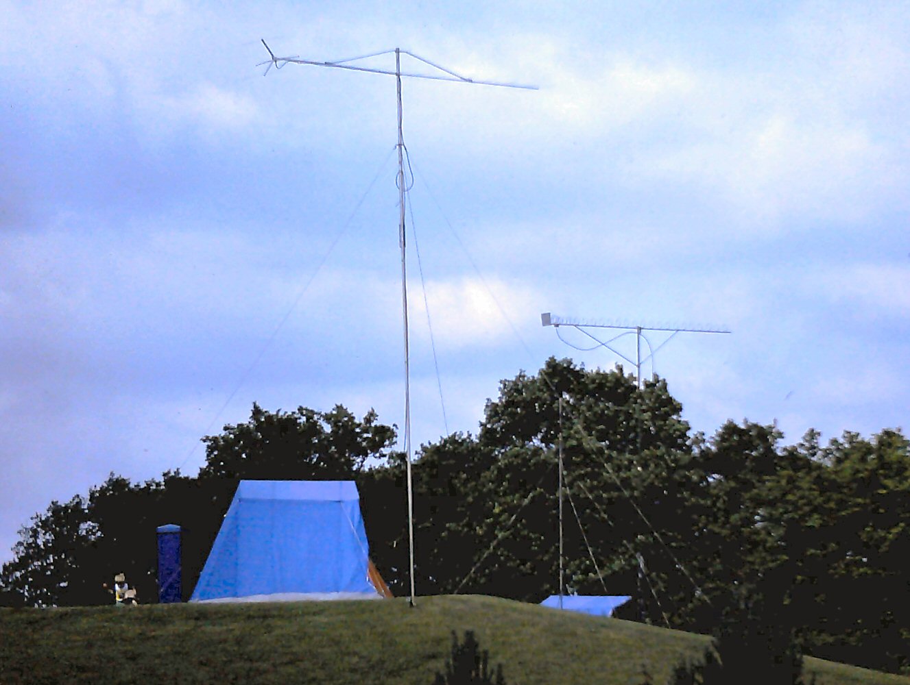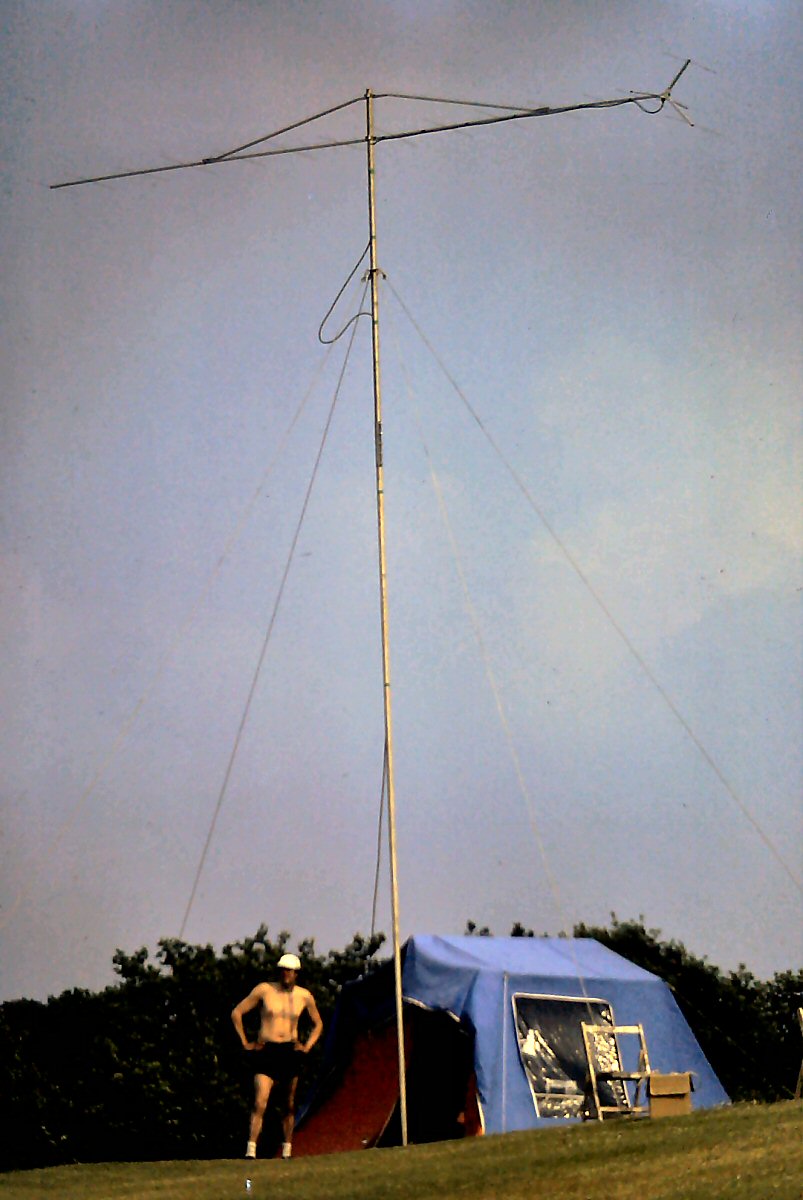 The 23cm station was provided by Willie G3VPK - with an amplifier using 2C39 valves, and a quad loop antenna from Dick G3WHR fed via LDF4-50 Heliax. Full details of the equipment used on other bands are not known but antennas comprised a long Yagi for 2m, and quad loop Yagi for 70cm. An "Armstrong" rotator was used on all bands. The highly directional antennas meant that most of the 23cm contacts were arranged following a 70cm contact - so the two stations had to be within speaking/shouting distance.